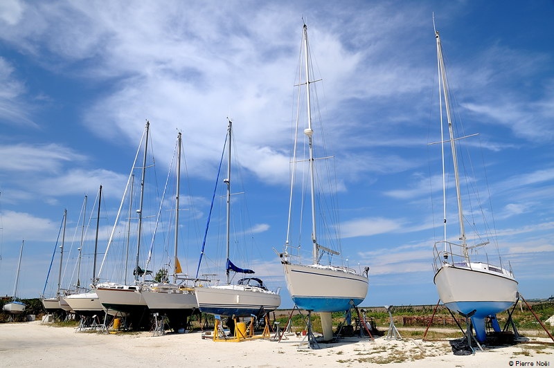 En traversant ce petit chantier naval, de l’autre côté du grillage, on aperçoit les marais et les prés de l’estuaire de la Gironde.